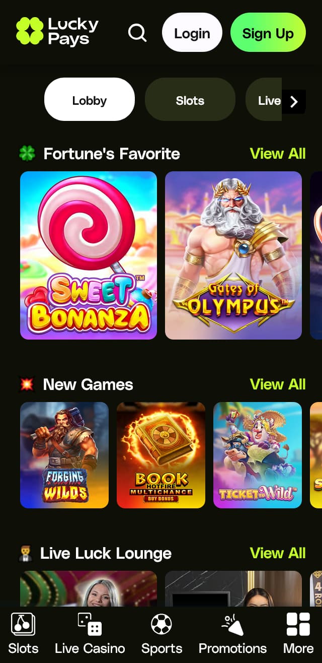 Lucky Pays biedt slots, tafelspellen, live casino games en meer van topsoftwareleveranciers.